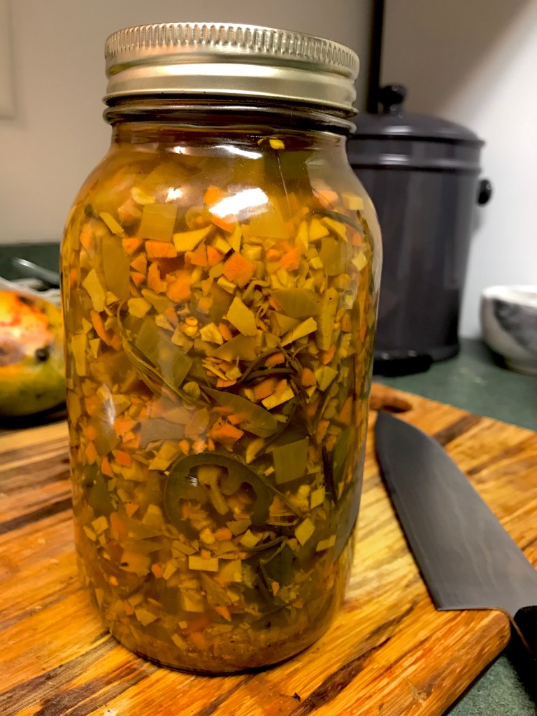 *2 x hot peppers of choice (total 4) (I use Habenero and Jalapeno) – cut stem, course chop (use the seeds!)